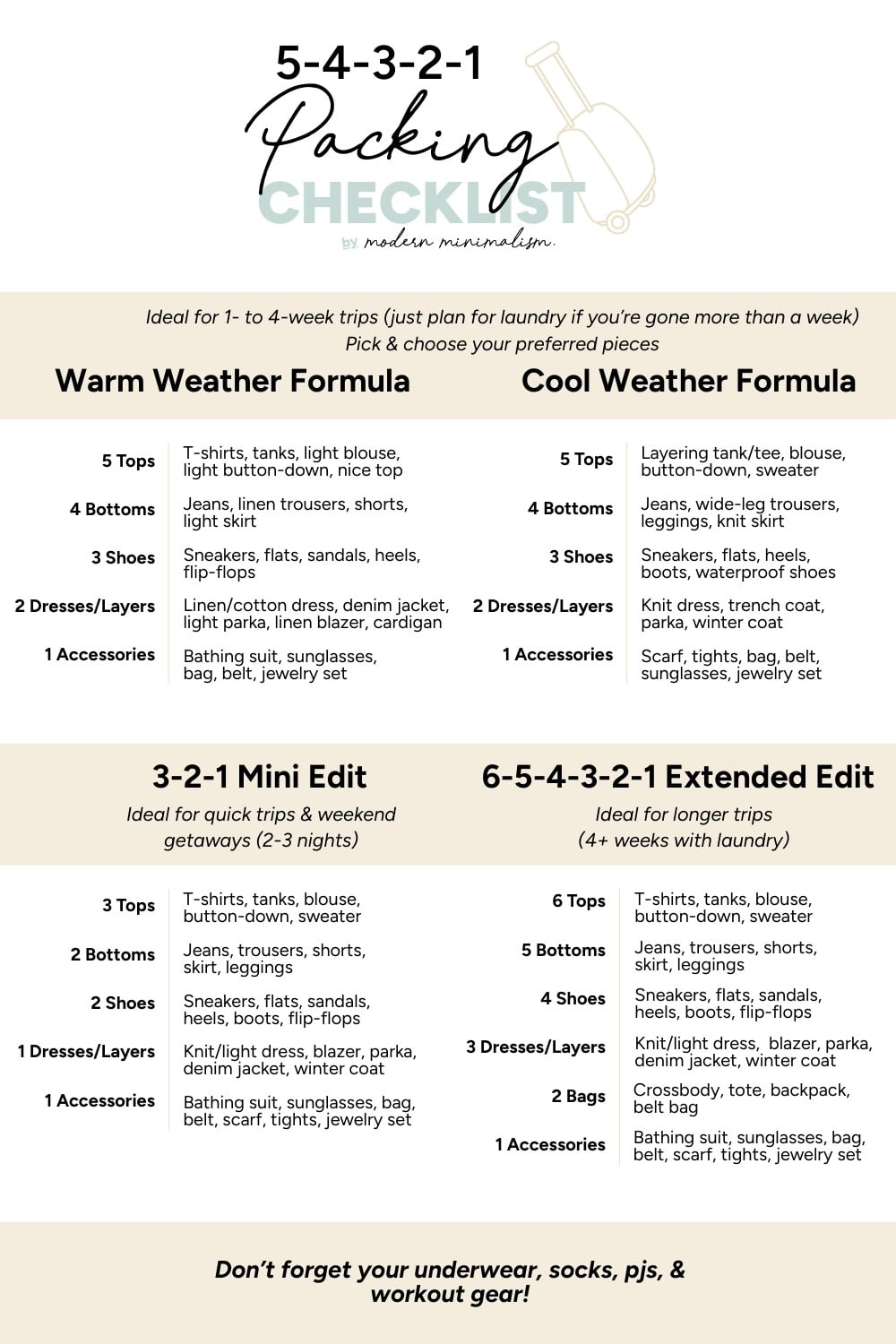 - Two 5-4-3-2-1 formulas (one for warm weather, one for cooler trips)